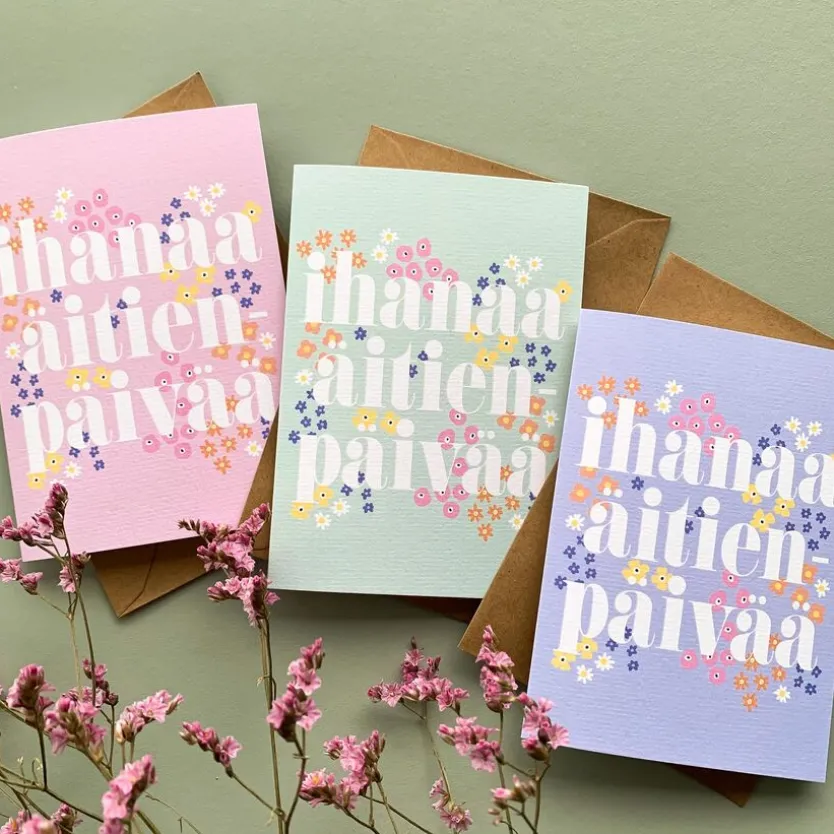 Painettu ympäristösertifioidulle taidekartongille Iisalmessa. Sisältää ruskean kierrätyspaperisen kirjekuoren.