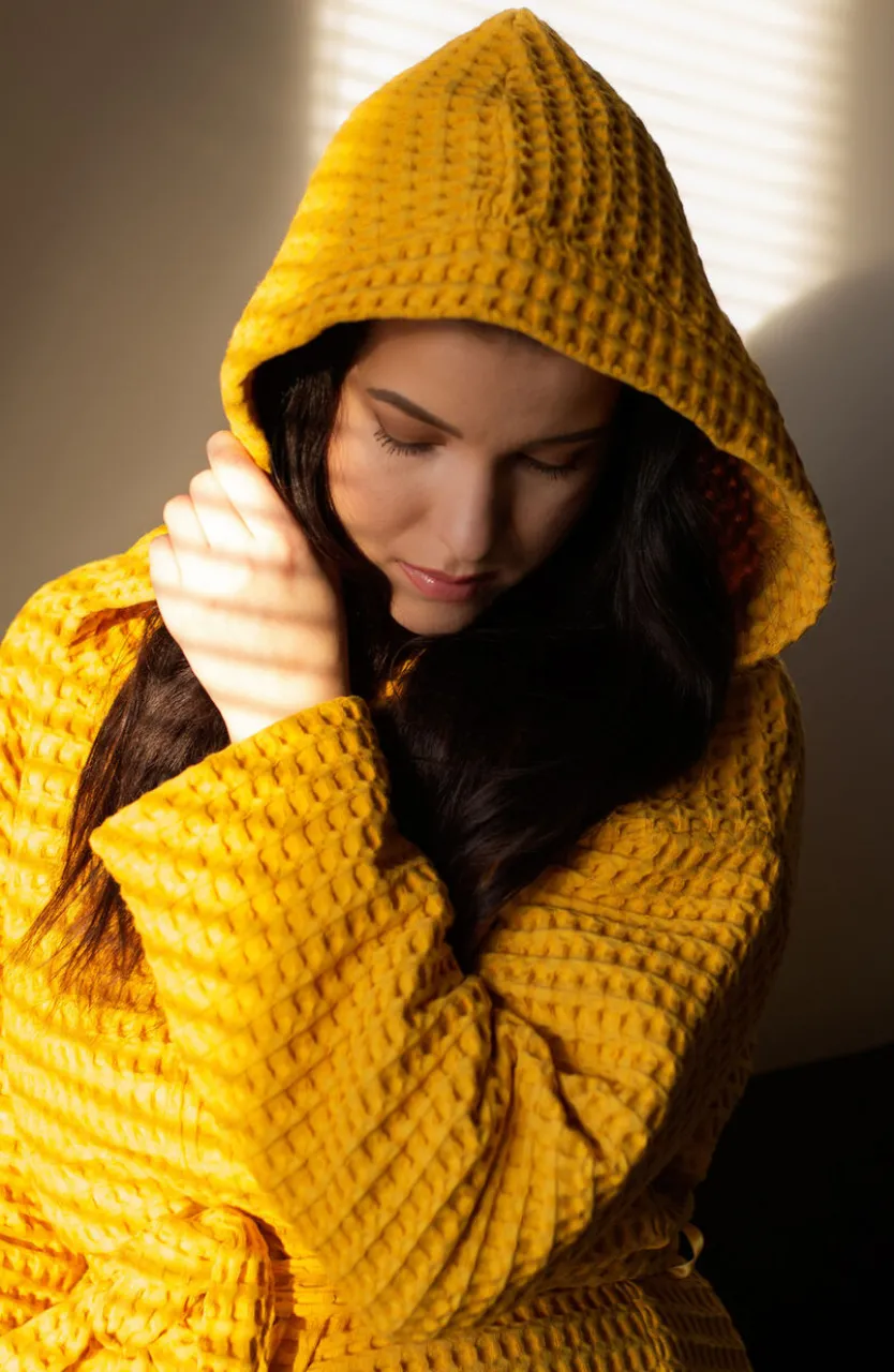 Keltainen Design -merkin aikuisten kylpytakki keltaisessa okran sävyssä.